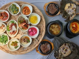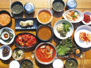 돌솥밥+간장게장+나물류+보쌈+된장찌개+전 종류+잡채+묵무침 등
