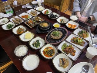 잡채, 묵무침, 더덕구이, 나물, 김치전, 생선구이, 된장찌개, 떡갈비 등